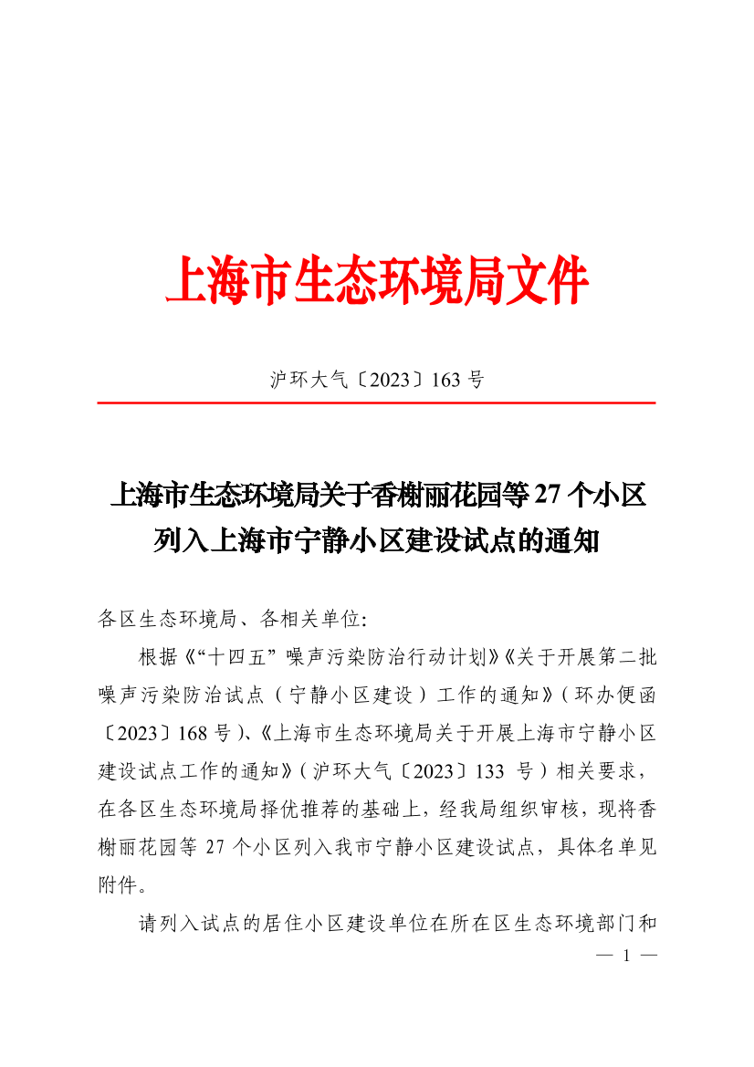 根据《“十四五”噪声污染防治行动计划》《关于开展第二批噪声污染防治试点(宁静小区建设)工作的通知》(环办便函〔2023〕168号)、《上海市生态环境局关于开展上海市宁静小区建设试点工作的通知》(沪环大气〔2023〕133号)相关要求,在各区生态环境局择优推荐的基础上,经我局组织审核,现将香榭丽花园等27个小区列入我市宁静小区建设试点,具体名单见附件。