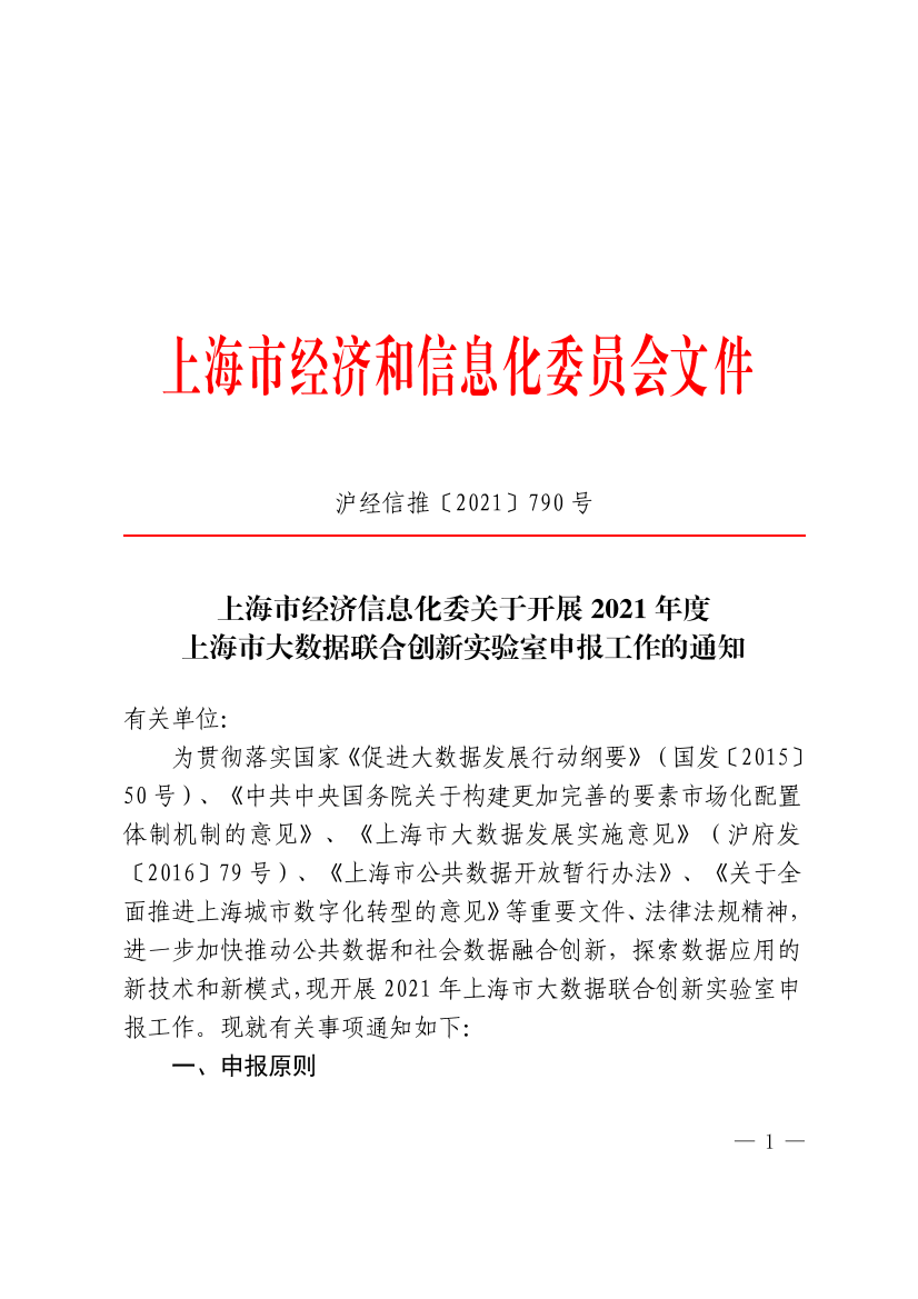 为贯彻落实国家《促进大数据发展行动纲要》(国发〔2015〕50号)、《中共中央国务院关于构建更加完善的要素市场化配置体制机制的意见》、《上海市大数据发展实施意见》(沪府发〔2016〕79号)、《上海市公共数据开放暂行办法》、《关于全面推进上海城市数字化转型的意见》等重要文件、法律法规精神,进一步加快推动公共数据和社会数据融合创新,探索数据应用的新技术和新模式,现开展2021年上海市大数据联合创新实验室申报工作。现就有关事项通知如下: