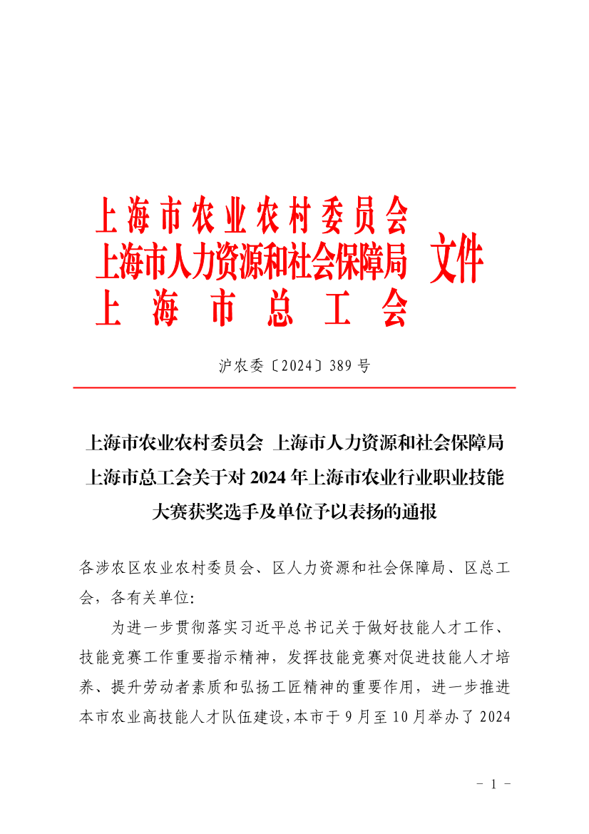 为进一步贯彻落实习近平总书记关于做好技能人才工作、技能竞赛工作重要指示精神,发挥技能竞赛对促进技能人才培养、提升劳动者素质和弘扬工匠精神的重要作用,进一步推进本市农业高技能人才队伍建设,本市于9月至10月举办了2024年上海市农业行业职业技能大赛(以下简称“农业行业技能大赛”)。根据《上海市农业农村委员会、上海市人力资源和社会保障局、上海市总工会关于举办2024年上海市农业行业职业技能大赛的通知》(沪农委〔2024〕353号)的相关要求,现决定对“农业行业技能大赛”的获奖选手及单位予以通报表扬。具体如下:
