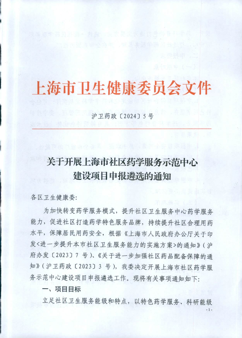 为加快转变药学服务模式,提升社区卫生服务中心药学服务能力,促进社区打造药学特色服务品牌,持续提升社区合理用药水平,保障居民用药安全,根据《上海市人民政府办公厅关于印发<进一步提升本市社区卫生服务能力的实施方案>的通知》(沪府办发〔2023〕7号)、《关于进一步加强社区药品配备保障的通知》(沪卫药政〔2023〕3号),我委决定开展上海市社区药学服务示范中心建设项目申报遴选工作。现将有关事项通知如下: