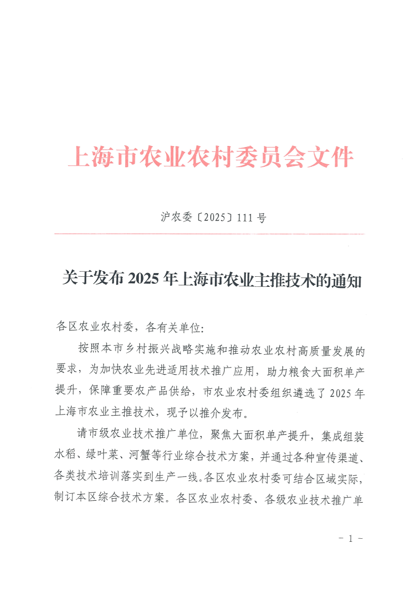 按照本市乡村振兴战略实施和推动农业农村高质量发展的要求,为加快农业先进适用技术推广应用,助力粮食大面积单产提升,保障重要农产品供给,市农业农村委组织遴选了2025年上海市农业主推技术,现予以推介发布。