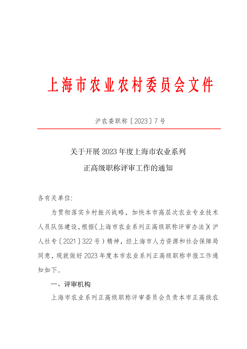 为贯彻落实乡村振兴战略,加快本市高层次农业专业技术人员队伍建设,根据《上海市农业系列正高级职称评审办法》(沪人社专〔2021〕322号)精神,经上海市人力资源和社会保障局同意,现就做好2023年度本市农业系列正高级职称申报工作通知如下。