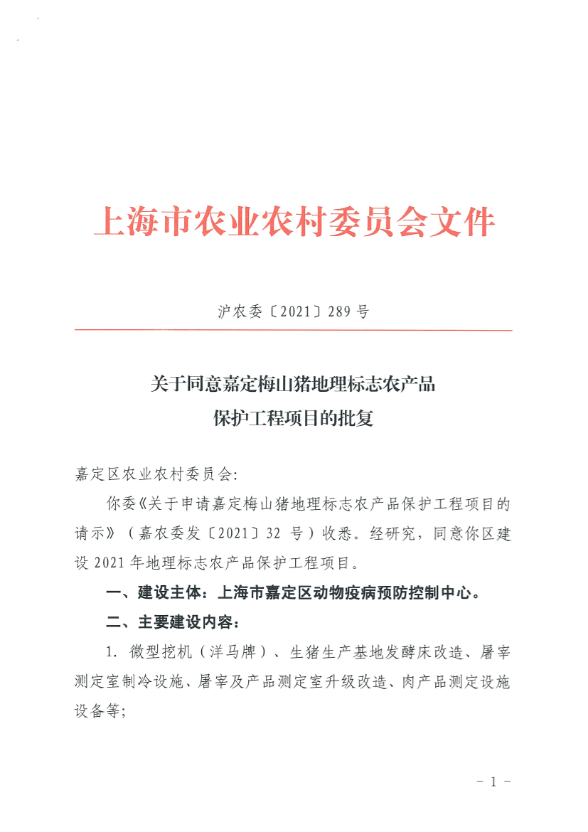 你委《关于申请嘉定梅山猪地理标志农产品保护工程项目的请示》(嘉农委发〔2021〕32 号)收悉。经研究,同意你区建设2021年地理标志农产品保护工程项目。