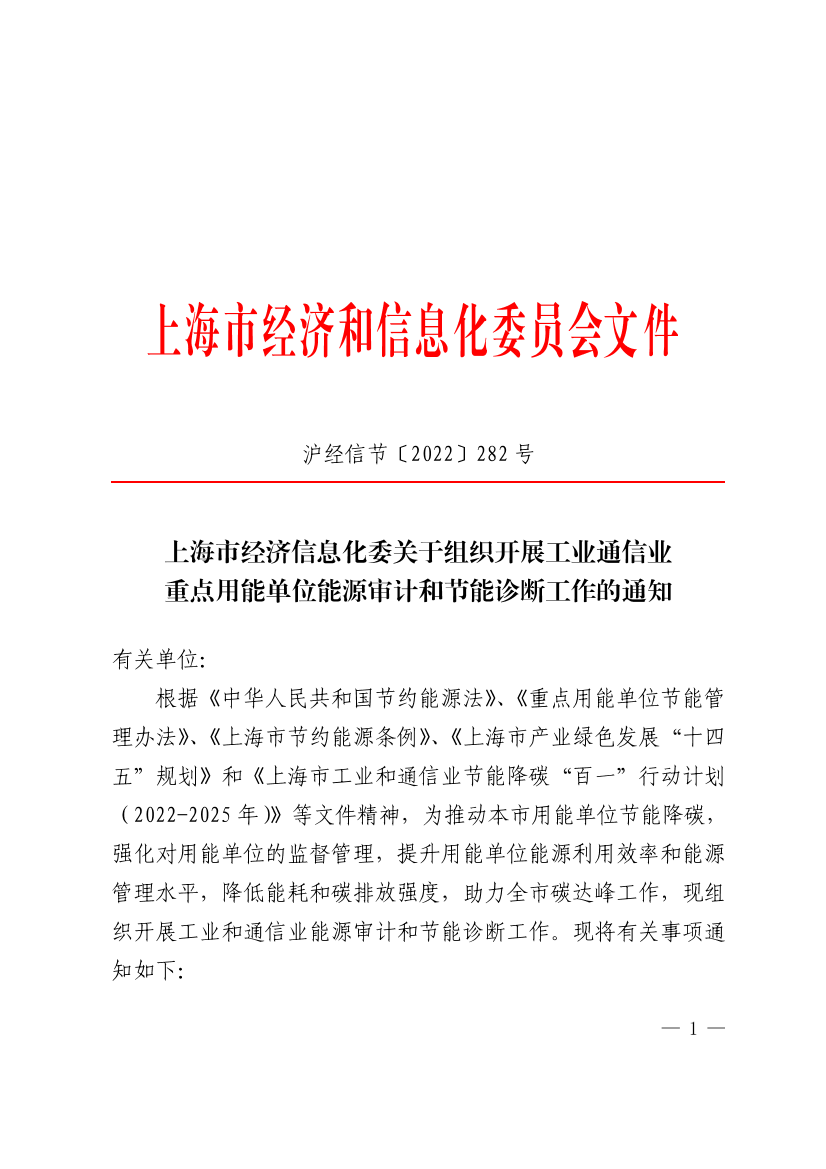 根据《中华人民共和国节约能源法》、《重点用能单位节能管理办法》、《上海市节约能源条例》、《上海市产业绿色发展“十四五”规划》和《上海市工业和通信业节能降碳“百一”行动计划(2022-2025年)》等文件精神,为推动本市用能单位节能降碳,强化对用能单位的监督管理,提升用能单位能源利用效率和能源管理水平,降低能耗和碳排放强度,助力全市碳达峰工作,现组织开展工业和通信业能源审计和节能诊断工作。现将有关事项通知如下:
