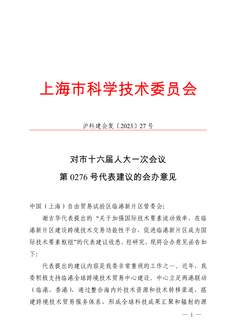 谢吉华代表提出的“关于加强国际技术要素流动效率,在临港新片区建设跨境技术交易功能性平台,促进临港新片区成为国际技术要素枢纽”的代表建议收悉,经研究,现将会办意见函告如下: