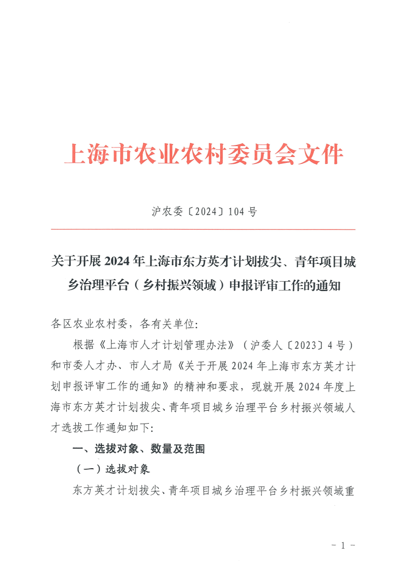 根据《上海市人才计划管理办法》(沪委人〔2023〕4号)和市委人才办、市人才局《关于开展2024年上海市东方英才计划申报评审工作的通知》的精神和要求,现就开展2024年度上海市东方英才计划拔尖、青年项目城乡治理平台乡村振兴领域人才选拔工作通知如下:
