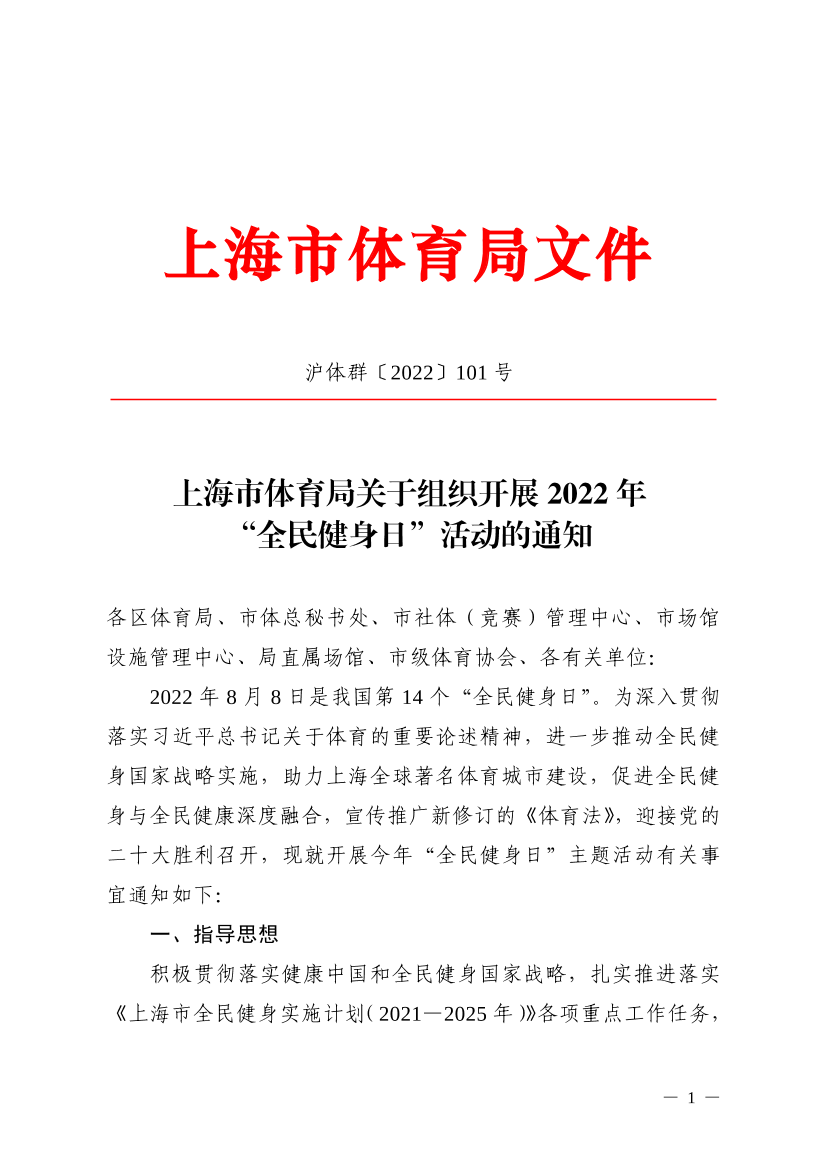 2022年8月8日是我国第14个“全民健身日”。为深入贯彻落实习近平总书记关于体育的重要论述精神,进一步推动全民健身国家战略实施,助力上海全球著名体育城市建设,促进全民健身与全民健康深度融合,宣传推广新修订的《体育法》,迎接党的二十大胜利召开,现就开展今年“全民健身日”主题活动有关事宜通知如下: