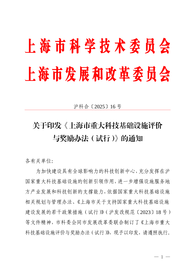 为加快建设具有全球影响力的科技创新中心,充分发挥在沪国家重大科技基础设施的创新引领作用,进一步增强设施服务地方产业发展和科技创新的支撑能力,依据国家重大科技基础设施相关规划与管理办法、《上海市关于支持国家重大科技基础设施建设发展的若干政策措施(试行)》(沪发改规范〔2023〕18号)等文件精神,市科委会同市发展改革委联合制订了《上海市重大科技基础设施评价与奖励办法(试行)》,现予以印发,请遵照执行。