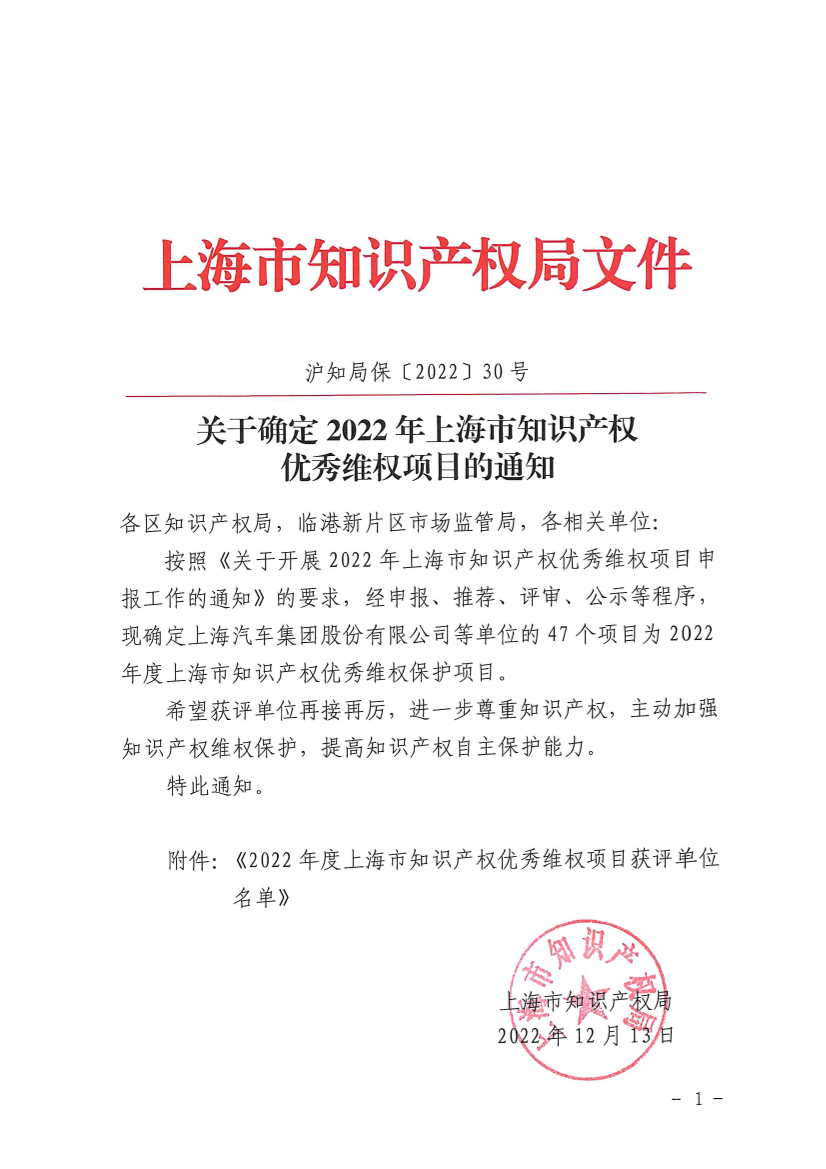 按照《关于开展2022年上海市知识产权优秀维权项目申报工作的通知》的要求,经申报、推荐、评审、公示等程序,现确定上海汽车集团股份有限公司等单位的47个项目为2022年度上海市知识产权优秀维权保护项目。
