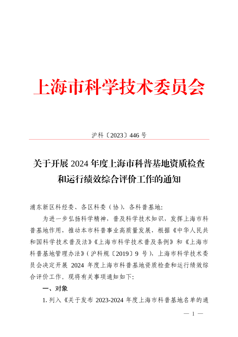 1.列入《关于发布2023-2024年度上海市科普基地名单的通知》(沪科〔2023〕121号)的示范性科普场馆参加2024年度科普基地资质检查(详见附件)。