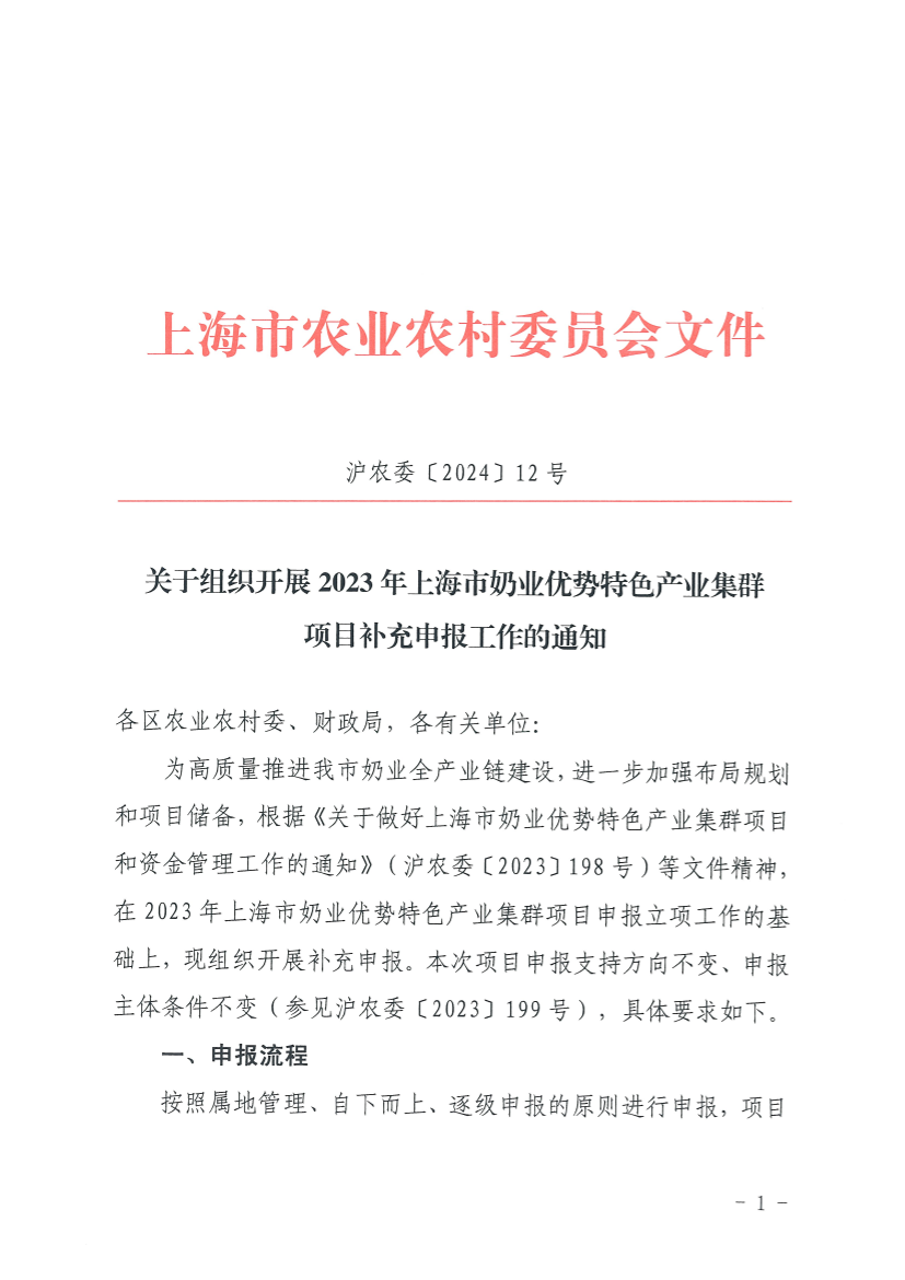 为高质量推进我市奶业全产业链建设,进一步加强布局规划和项目储备,根据《关于做好上海市奶业优势特色产业集群项目和资金管理工作的通知》(沪农委〔2023〕198号)等文件精神,在2023年上海市奶业优势特色产业集群项目申报立项工作的基础上,现组织开展补充申报。本次项目申报支持方向不变、申报主体条件不变(参见沪农委〔2023〕199号),具体要求如下。