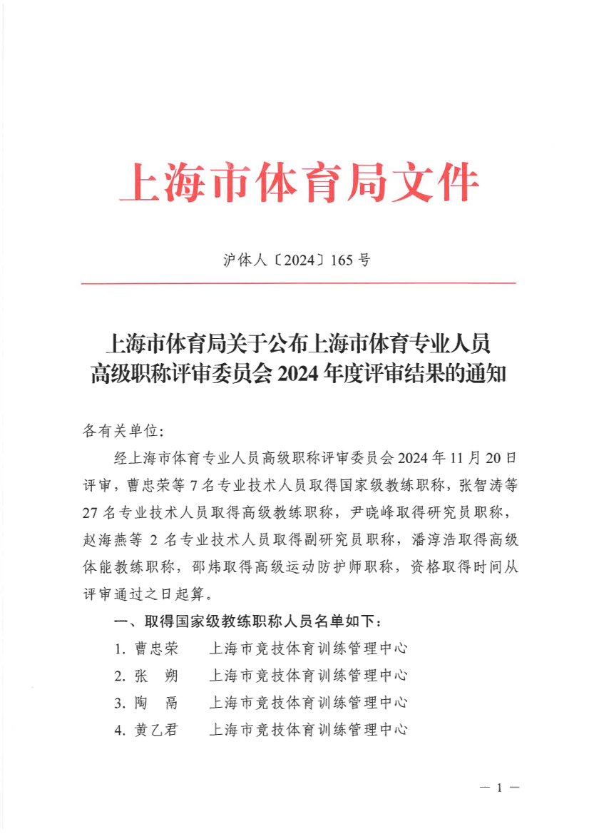 经上海市体育专业人员高级职称评审委员会2024年11月20日评审,曹忠荣等7名专业技术人员取得国家级教练职称,张智涛等27名专业技术人员取得高级教练职称,尹晓峰取得研究员职称,赵海燕等2名专业技术人员取得副研究员职称,潘淳浩取得高级体能教练职称,邵炜取得高级运动防护师职称,资格取得时间从评审通过之日起算。