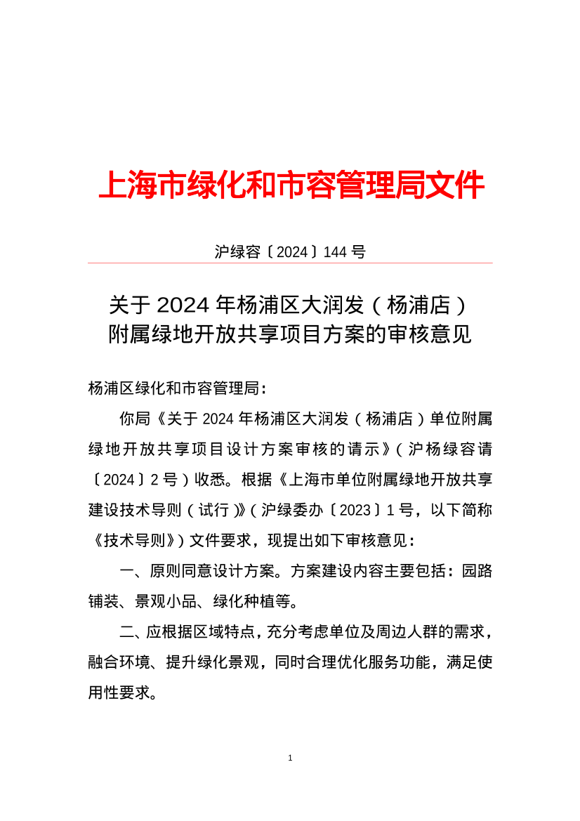 你局《关于 2024年杨浦区大润发(杨浦店)单位附属绿地开放共享项目设计方案审核的请示》(沪杨绿容请〔2024〕2号)收悉。根据《上海市单位附属绿地开放共享建设技术导则(试行)》(沪绿委办〔2023〕1号,以下简称《技术导则》)文件要求,现提出如下审核意见: