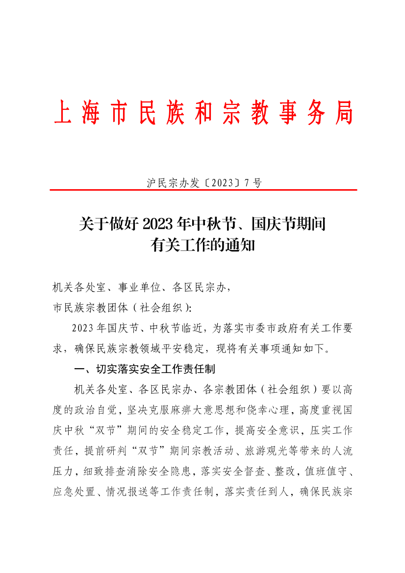 2023年国庆节、中秋节临近,为落实市委市政府有关工作要求,确保民族宗教领域平安稳定,现将有关事项通知如下。