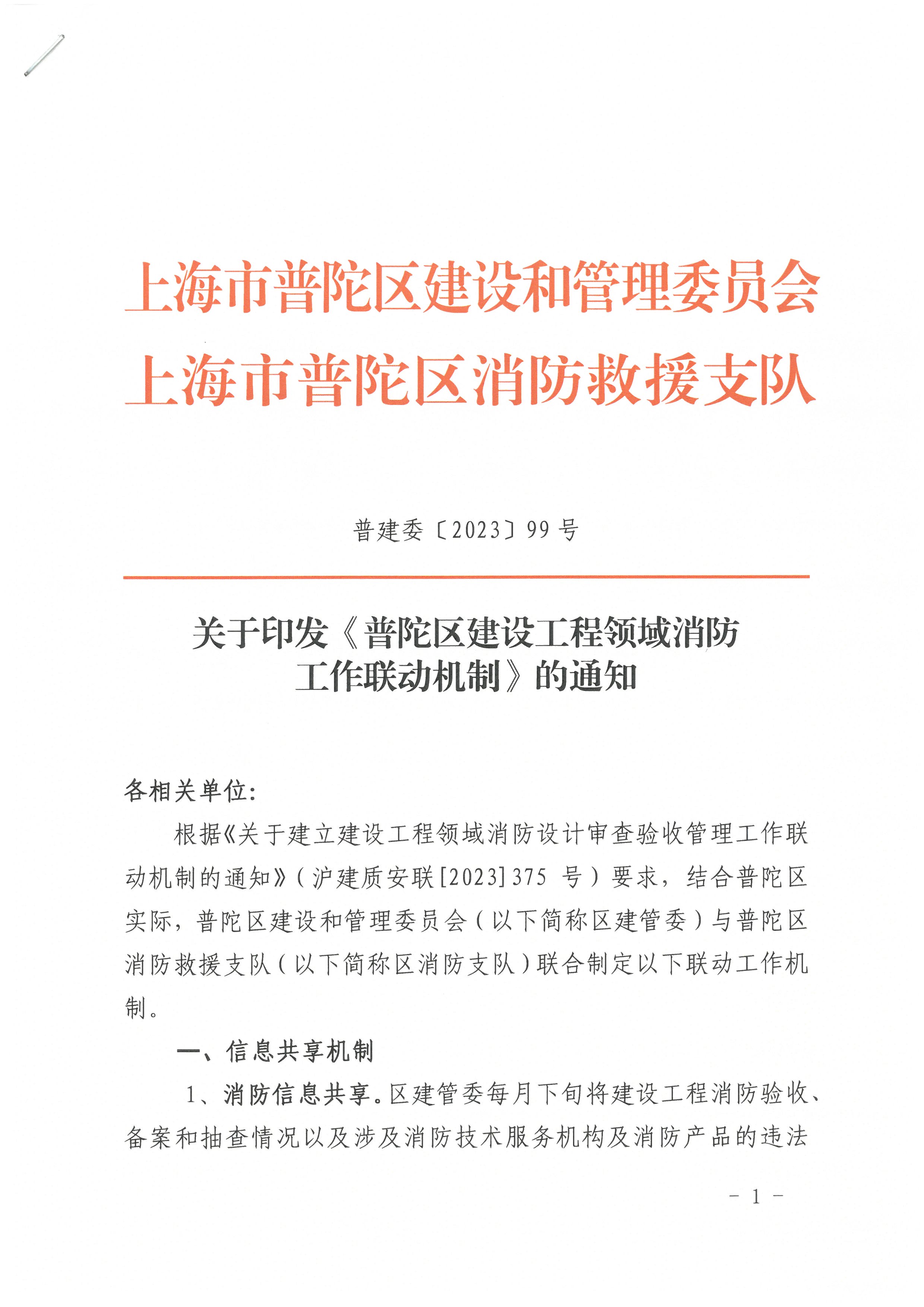 根据《关于建立建设工程领域消防设计审查验收管理工作联动机制的通知》(沪建质安联[2023]375号)要求,结合普陀区实际,普陀区建设和管理委员会(以下简称区建管委)与普陀区消防救援支队(以下简称区消防支队)联合制定以下联动工作机制。
