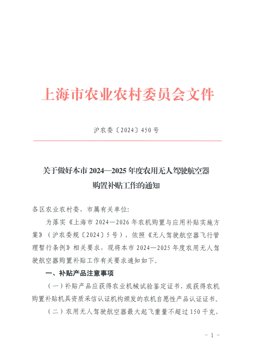 为落实《上海市2024—2026年农机购置与应用补贴实施方案》(沪农委规〔2024〕5号),依照《无人驾驶航空器飞行管理暂行条例》相关要求,现将本市2024—2025年度农用无人驾驶航空器购置补贴工作有关要求通知如下。