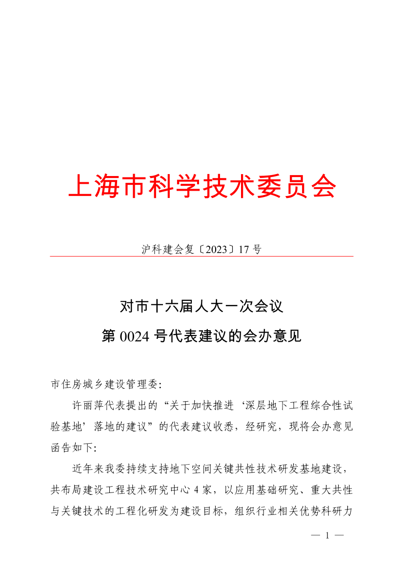 许丽萍代表提出的“关于加快推进‘深层地下工程综合性试验基地’落地的建议”的代表建议收悉,经研究,现将会办意见函告如下: