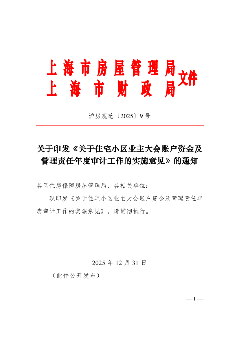 本通知自2026年3月1日起施行,有效期至2030年12月31日。原《关于住宅小区专项维修资金、公共收益的收支情况以及业主委员会工作经费年度审计工作有关问题的通知》(沪房规范〔2021〕8号)废止。