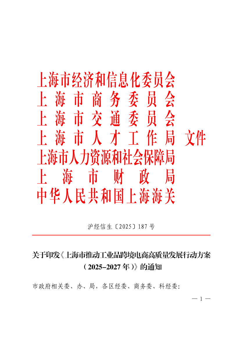 为贯彻落实市委、市政府关于加快工业服务业发展的工作要求,大力促进工业品跨境电商高质量发展,助力应对全球经济贸易风险和挑战,培育产业经济新增长点,提升产业链供应链韧性和安全水平,打造现代化产业体系。上海市经济和信息化委员会、上海市商务委员会、上海市交通委员会、上海市人才工作局、上海市人力资源和社会保障局、上海市财政局、上海海关联合制定了《上海市推动工业品跨境电商高质量发展行动方案(2025-2027年)》。经市政府同意,现印发给你们,请认真贯彻执行。