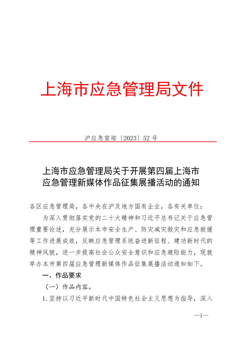 为深入贯彻落实党的二十大精神和习近平总书记关于应急管理重要论述,充分展示本市安全生产、防灾减灾救灾和应急救援等工作进展成效,反映应急管理系统奋进新征程、建功新时代的精神风貌,进一步提高社会公众安全意识和应急避险能力,现就举办本市第四届应急管理新媒体作品征集展播活动通知如下。