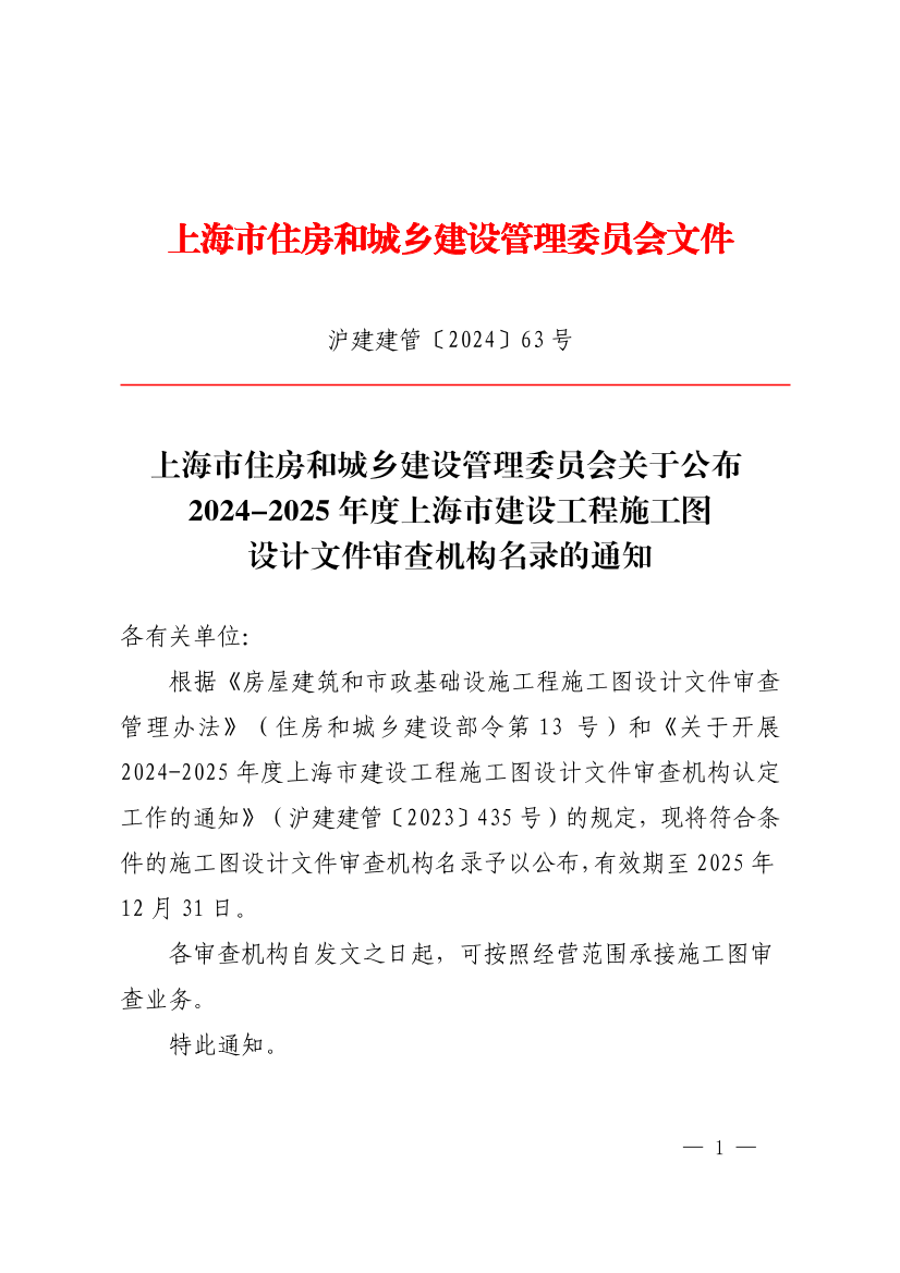 根据《房屋建筑和市政基础设施工程施工图设计文件审查管理办法》(住房和城乡建设部令第13 号)和《关于开展 2024-2025年度上海市建设工程施工图设计文件审查机构认定工作的通知》(沪建建管〔2023〕435号)的规定,现将符合条件的施工图设计文件审查机构名录予以公布,有效期至2025年12月31日。