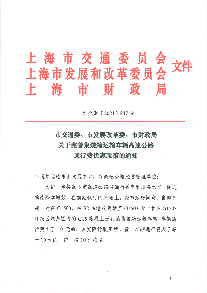 为进一步提高本市高速公路网通行效率和服务水平,促进物流降本增效,在前期试行的基础上,经市政府同意,自即日起,对在G1503、在S2临港收费站至G1503段上和在G1503环线区域范围内的G15路段上通行的集装箱运输车辆,车辆通行费小于10元的,以实际行驶里程计费;车辆通行费大于等于10元的,统一按10元收取。