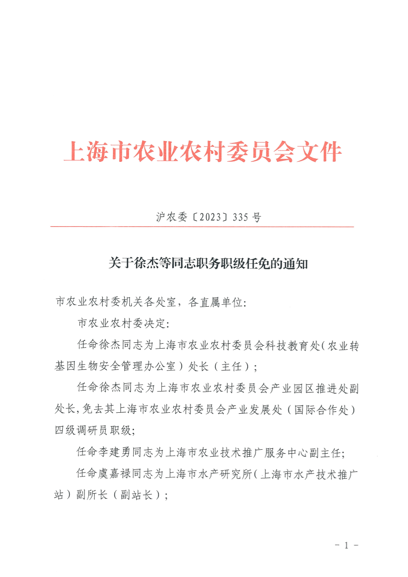 任命徐杰同志为上海市农业农村委员会科技教育处(农业转基因生物安全管理办公室)处长(主任);