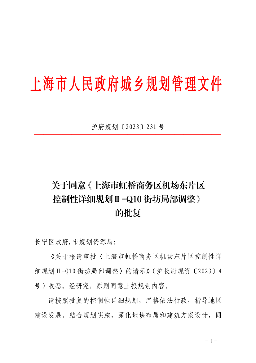 《关于报请审批〈上海市虹桥商务区机场东片区控制性详细规划Ⅱ-Q10街坊局部调整〉的请示》(沪长府规资〔2023〕4号)收悉。经研究,原则同意上报规划内容。