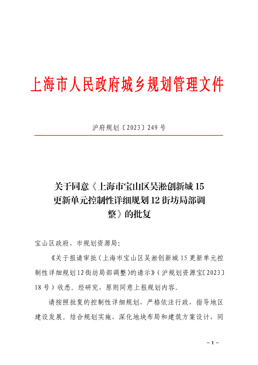 《关于报请审批〈上海市宝山区吴淞创新城15更新单元控制性详细规划12街坊局部调整〉的请示》(沪规划资源宝〔2023〕18号)收悉。经研究,原则同意上报规划内容。