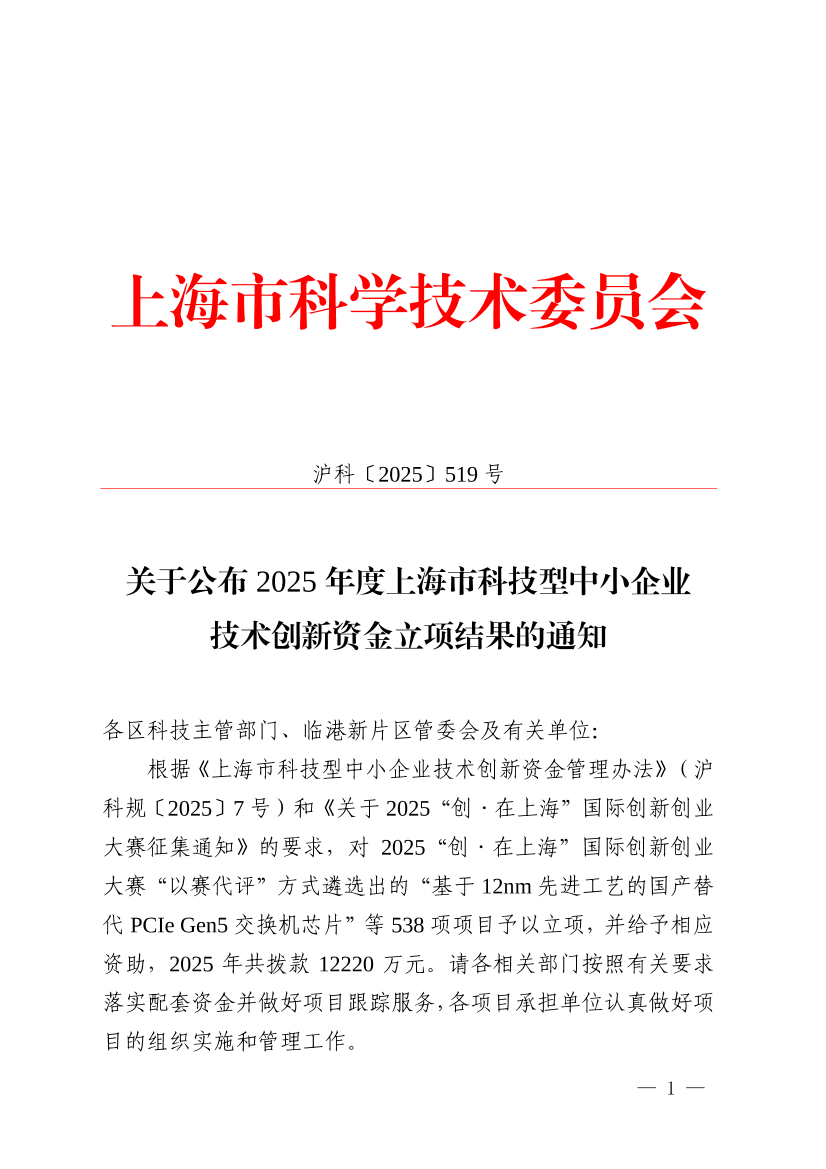 根据《上海市科技型中小企业技术创新资金管理办法》(沪科规〔2025〕7号)和《关于2025“创·在上海”国际创新创业大赛征集通知》的要求,对2025“创·在上海”国际创新创业大赛“以赛代评”方式遴选出的“基于12nm先进工艺的国产替代PCIe Gen5交换机芯片”等538项项目予以立项,并给予相应资助,2025年共拨款12220万元。请各相关部门按照有关要求落实配套资金并做好项目跟踪服务,各项目承担单位认真做好项目的组织实施和管理工作。