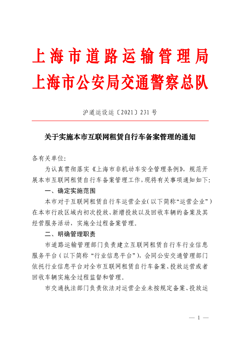 为认真贯彻落实《上海市非机动车安全管理条例》,规范开展本市互联网租赁自行车备案管理工作,现将有关事项通知如下: