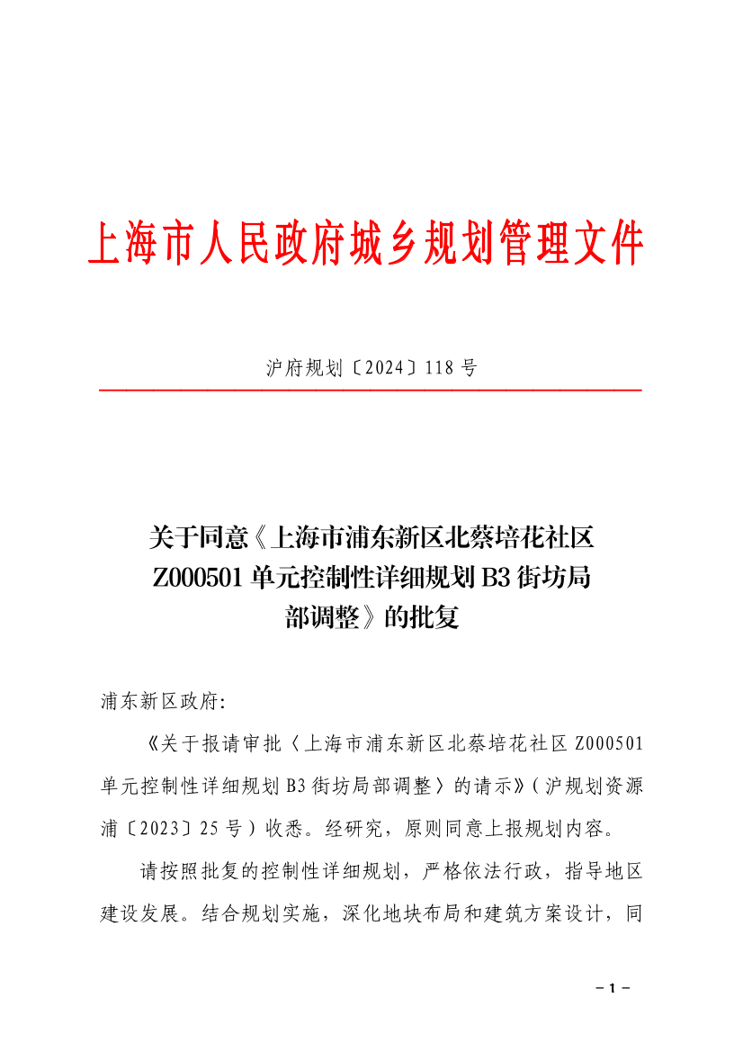 《关于报请审批〈上海市浦东新区北蔡培花社区Z000501单元控制性详细规划B3街坊局部调整〉的请示》(沪规划资源浦〔2023〕25号)收悉。经研究,原则同意上报规划内容。