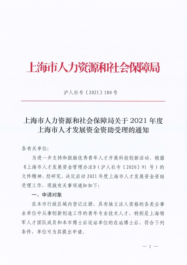 为进一步支持和鼓励优秀青年人才开展科技创新活动,根据《上海市人才发展资金管理办法》(沪人社专〔2020〕91号)的文件精神,经研究,决定启动2021年度上海市人才发展资金资助受理工作,现就有关事项通知如下: