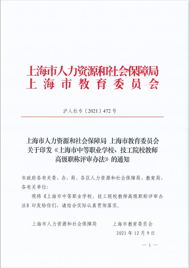 (一)组建上海市中等职业学校、技工院校教师正高级职称评审委员会(以下统一简称“高评委”),承担本市中等职业学校、技工院校正高级讲师、正高级实习指导教师职称的评审工作,评审委员会办公室设在上海市教育委员会。
