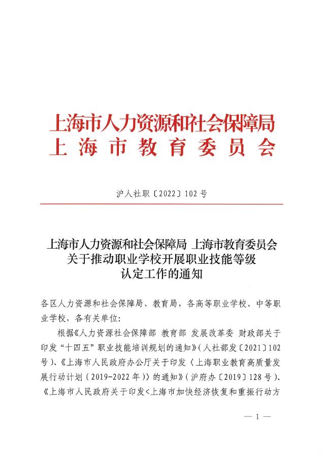 根据《人力资源社会保障部 教育部 发展改革委 财政部关于印发“十四五”职业技能培训规划的通知》(人社部发〔2021〕102号)、《上海市人民政府办公厅关于印发〈上海职业教育高质量发展行动计划(2019-2022年)〉的通知》(沪府办〔2019〕128号)、《上海市人民政府关于印发<上海市加快经济恢复和重振行动方案>的通知》(沪府规〔2022〕5号)的有关要求,为进一步提升职业学校学生职业技能水平,现就推动本市职业学校开展职业技能等级认定工作有关事项通知如下: