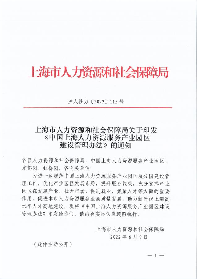 为进一步规范中国上海人力资源服务产业园区及分园建设管理工作,优化产业园区发展布局,提升服务能级,充分发挥产业园区在发展产业、壮大市场、促进就业、集聚人才等方面的重要作用,促进本市人力资源服务业高质量发展,助力新时代上海高水平人才高地建设,现将《中国上海人力资源服务产业园区建设管理办法》印发给你们,请结合实际认真遵照执行。