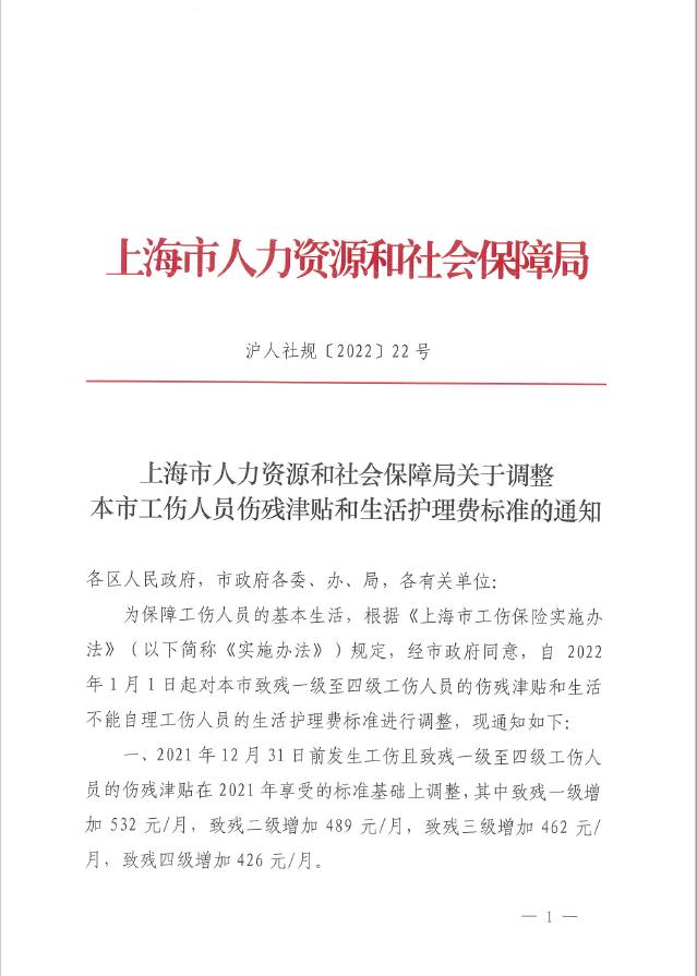 为保障工伤人员的基本生活,根据《上海市工伤保险实施办法》(以下简称《实施办法》)规定,经市政府同意,自2022年1月1日起对本市致残一级至四级工伤人员的伤残津贴和生活不能自理工伤人员的生活护理费标准进行调整,现通知如下: