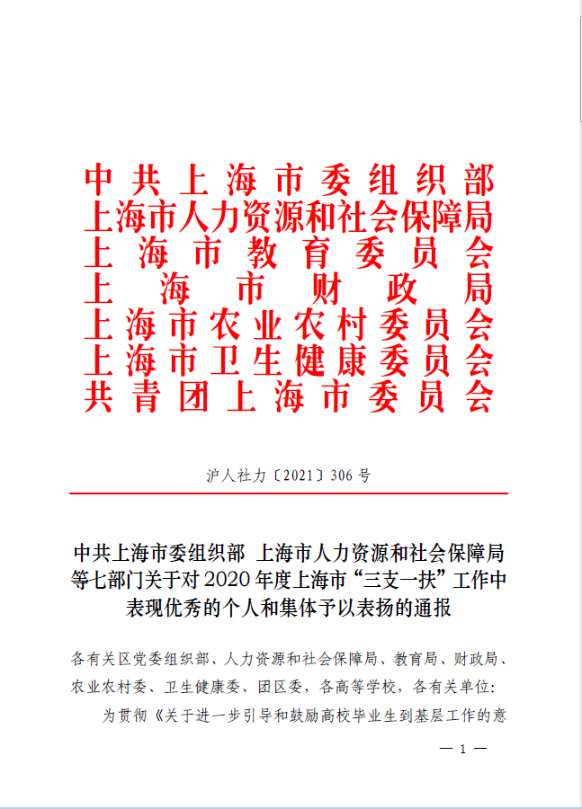 为进一步推动农村基层人才队伍建设,大力弘扬以勇于担当的责任意识、甘于奉献的精神追求、全心全意的服务态度、锐意进取的创新激情为主要内容的“三支一扶”精神,引导“三支一扶”人员扎根基层、服务基层,经基层单位和区“三支一扶”办公室、相关行业主管部门推荐,市“三支一扶”工作领导小组各成员单位审核,现决定对以下“三支一扶”优秀个人和集体予以通报表扬(排名不分先后):