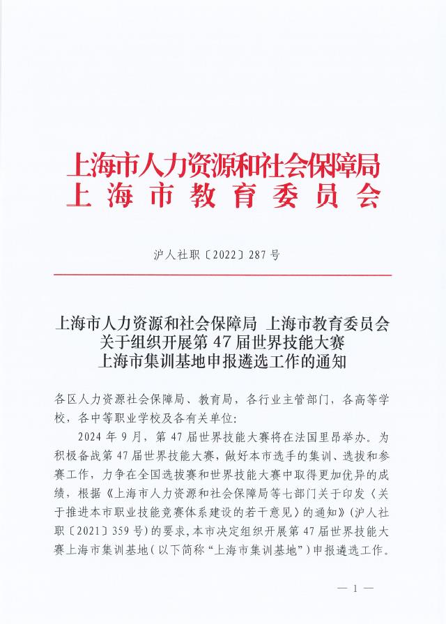 2024年9月,第47届世界技能大赛将在法国里昂举办。为积极备战第47届世界技能大赛,做好本市选手的集训、选拔和参赛工作,力争在全国选拔赛和世界技能大赛中取得更加优异的成绩,根据《上海市人力资源和社会保障局等七部门关于印发〈关于推进本市职业技能竞赛体系建设的若干意见〉的通知》(沪人社职〔2021〕359号)的要求,本市决定组织开展第47届世界技能大赛上海市集训基地(以下简称“上海市集训基地”)申报遴选工作。现就有关事宜通知如下: