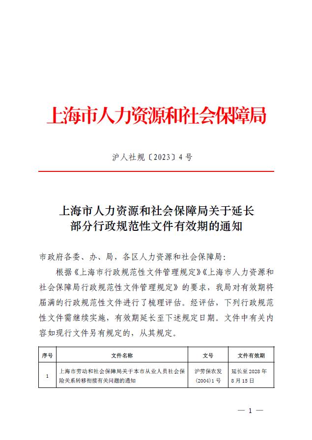 根据《上海市行政规范性文件管理规定》《上海市人力资源和社会保障局行政规范性文件管理规定》的要求,我局对有效期将届满的行政规范性文件进行了梳理评估。经评估,下列行政规范性文件需继续实施,有效期延长至下述规定日期。文件中有关内容如现行文件另有规定的,从其规定。