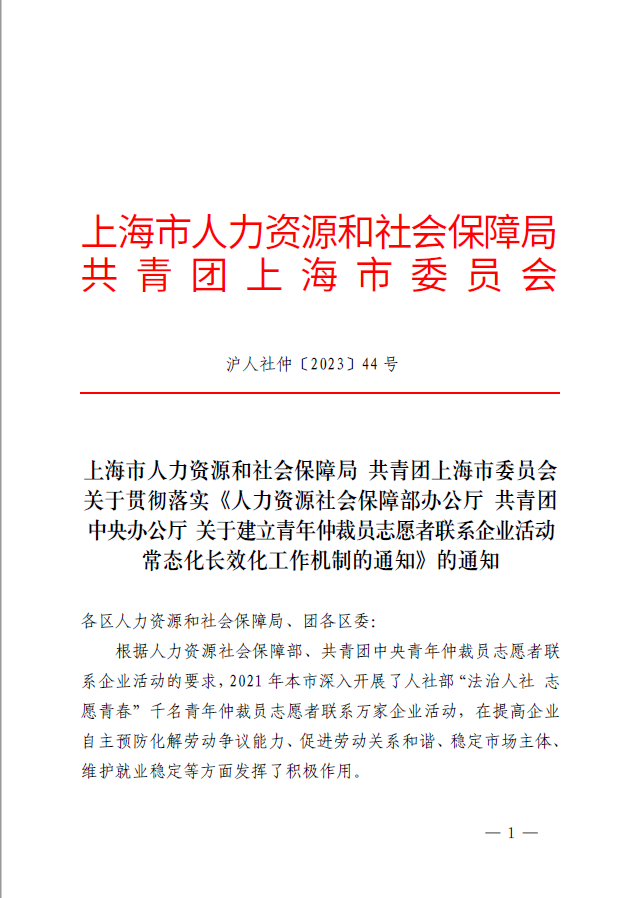 为深入贯彻党的二十大精神,落实“我为群众办实事”实践活动常态化长效化工作要求,人力资源社会保障部办公厅、共青团中央办公厅发布了《关于建立青年仲裁员志愿者联系企业活动常态化长效化工作机制的通知》(人社厅发〔2022〕55号),现将文件转发给你们,同时结合本市实际提出具体要求通知。