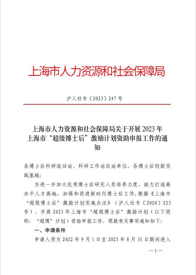 为进一步加大优秀博士后研究人员培养力度,助力打造高水平人才高地,加强和改进新时代博士后工作,根据《上海市“超级博士后”激励计划实施办法》(沪人社专〔2020〕223号),开展2023年上海市“超级博士后”激励计划(以下简称:“超博”计划)资助申报工作。现就有关事项通知如下: