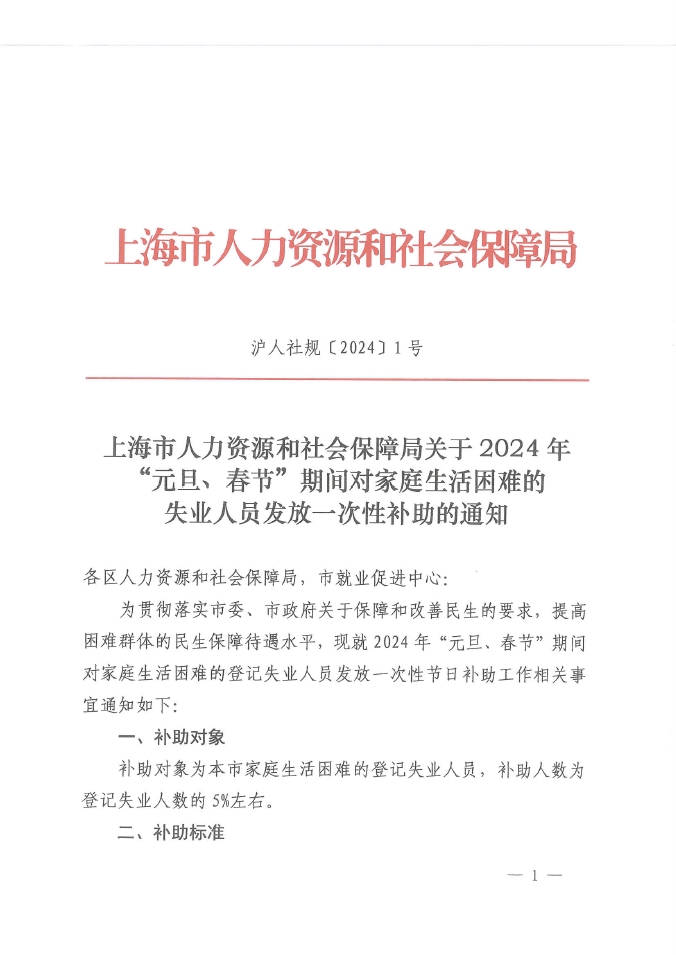 为贯彻落实市委、市政府关于保障和改善民生的要求,提高困难群体的民生保障待遇水平,现就2024年“元旦、春节”期间对家庭生活困难的登记失业人员发放一次性节日补助工作相关事宜通知如下: