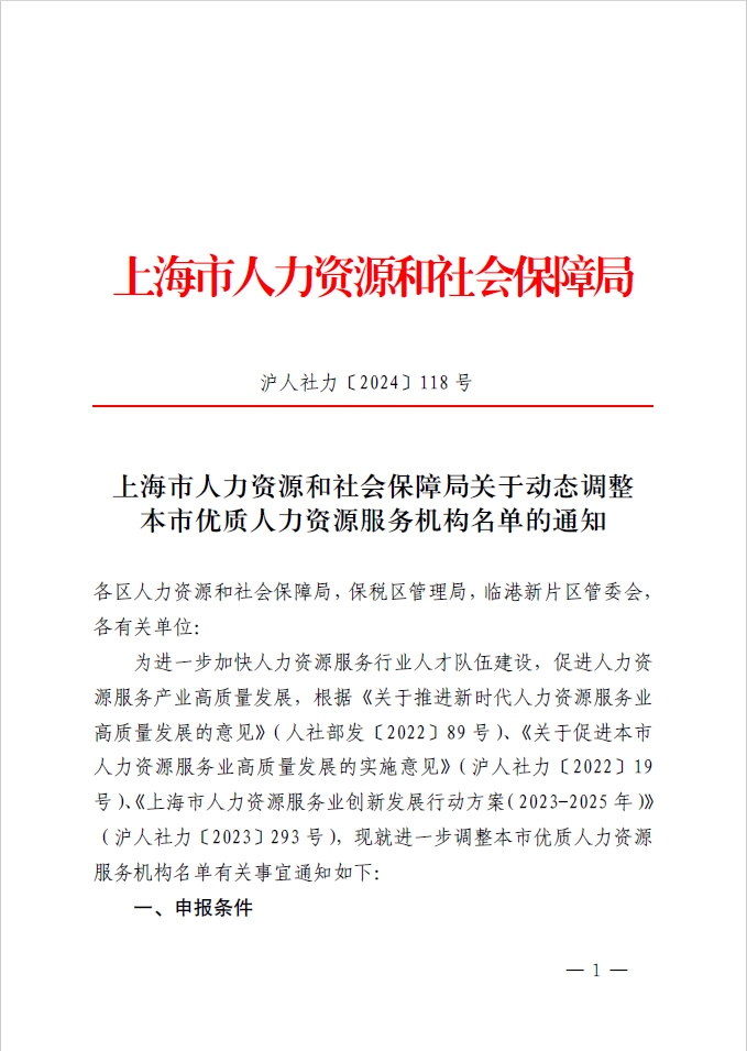 为进一步加快人力资源服务行业人才队伍建设,促进人力资源服务产业高质量发展,根据《关于推进新时代人力资源服务业高质量发展的意见》(人社部发〔2022〕89号)、《关于促进本市人力资源服务业高质量发展的实施意见》(沪人社力〔2022〕19号)、《上海市人力资源服务业创新发展行动方案(2023-2025年)》(沪人社力〔2023〕293号),现就进一步调整本市优质人力资源服务机构名单有关事宜通知如下: