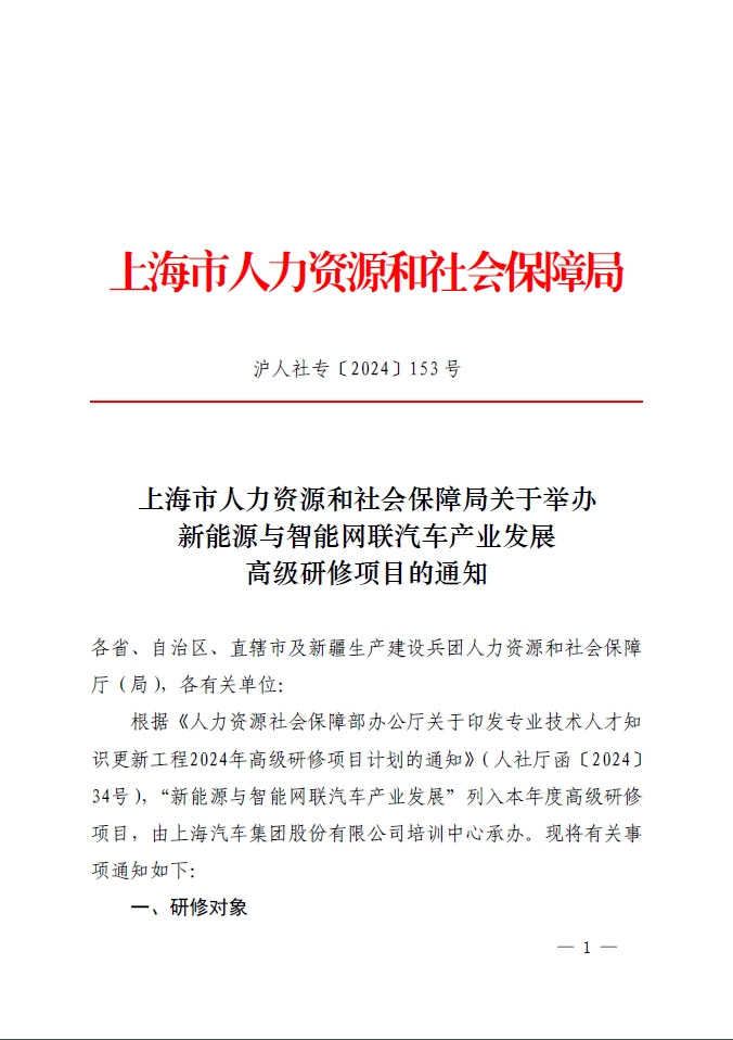 根据《人力资源社会保障部办公厅关于印发专业技术人才知识更新工程2024年高级研修项目计划的通知》(人社厅函〔2024〕34号),“新能源与智能网联汽车产业发展”列入本年度高级研修项目,由上海汽车集团股份有限公司培训中心承办。现将有关事项通知如下: