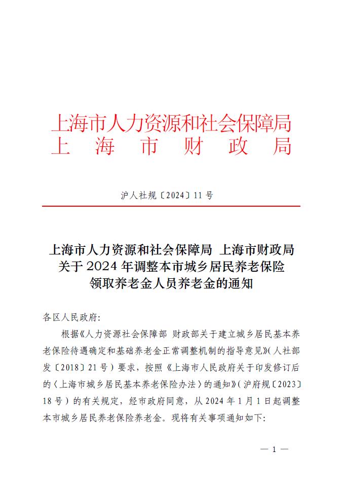 根据《人力资源社会保障部 财政部关于建立城乡居民基本养老保险待遇确定和基础养老金正常调整机制的指导意见》(人社部发〔2018〕21号)要求,按照《上海市人民政府关于印发修订后的〈上海市城乡居民基本养老保险办法〉的通知》(沪府规〔2023〕18号)的有关规定,经市政府同意,从2024年1月1日起调整本市城乡居民养老保险养老金。现将有关事项通知如下: