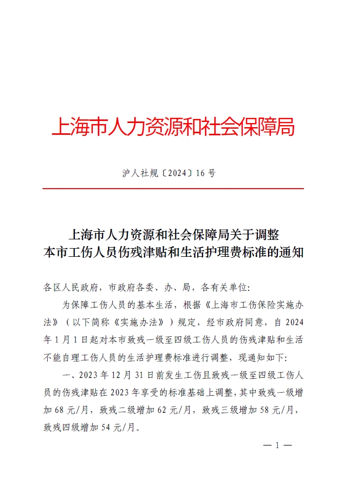 为保障工伤人员的基本生活,根据《上海市工伤保险实施办法》(以下简称《实施办法》)规定,经市政府同意,自2024年1月1日起对本市致残一级至四级工伤人员的伤残津贴和生活不能自理工伤人员的生活护理费标准进行调整,现通知如下: