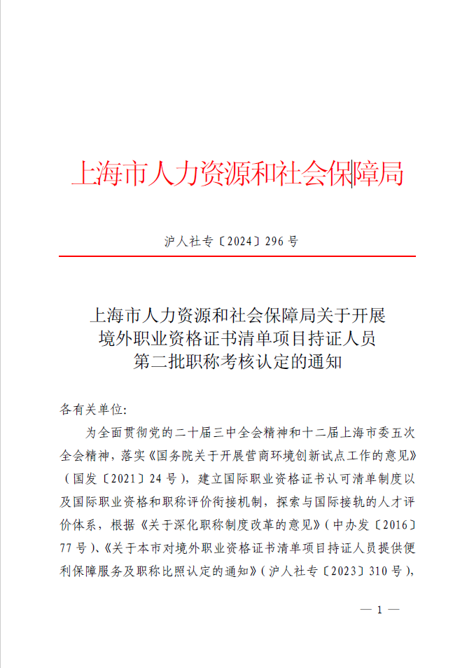 为全面贯彻党的二十届三中全会精神和十二届上海市委五次全会精神,落实《国务院关于开展营商环境创新试点工作的意见》(国发〔2021〕24号),建立国际职业资格证书认可清单制度以及国际职业资格和职称评价衔接机制,探索与国际接轨的人才评价体系,根据《关于深化职称制度改革的意见》(中办发〔2016〕77号)、《关于本市对境外职业资格证书清单项目持证人员提供便利保障服务及职称比照认定的通知》(沪人社专〔2023〕310号),市人力资源社会保障局组织开展境外职业资格证书清单项目持证人员第二批职称考核认定工作,现就有关事项通知如下: