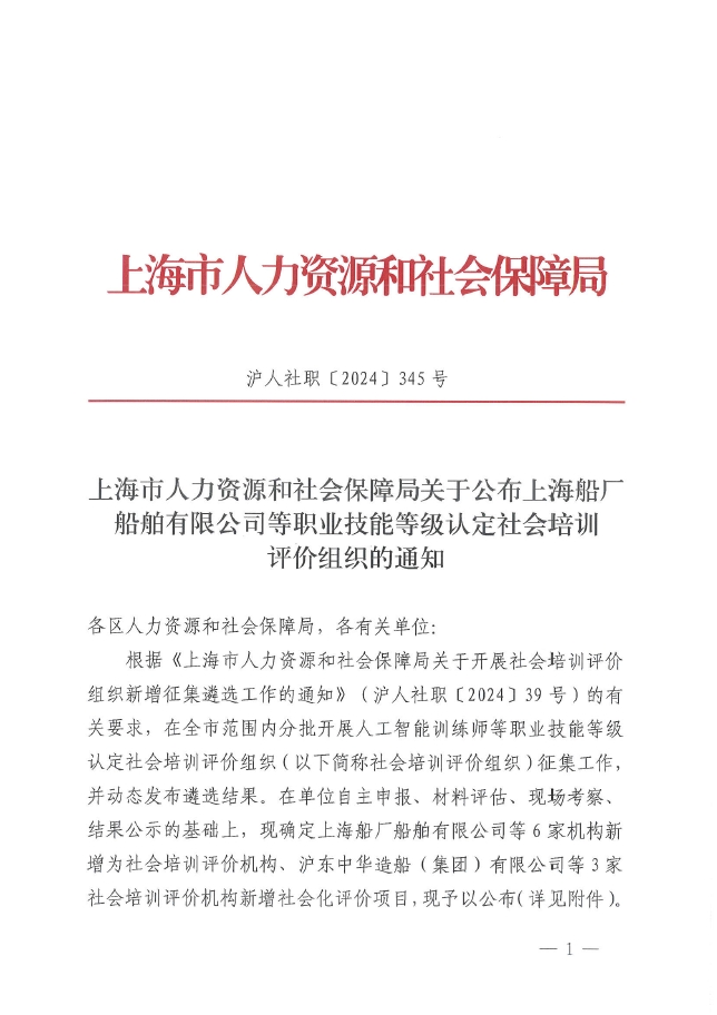根据《上海市人力资源和社会保障局关于开展社会培训评价组织新增征集遴选工作的通知》(沪人社职〔2024〕39号)的有关要求,在全市范围内分批开展人工智能训练师等职业技能等级认定社会培训评价组织(以下简称社会培训评价组织)征集工作,并动态发布遴选结果。在单位自主申报、材料评估、现场考察、结果公示的基础上,现确定上海船厂船舶有限公司等6家机构新增为社会培训评价机构、沪东中华造船(集团)有限公司等3家社会培训评价机构新增社会化评价项目,现予以公布(详见附件)。上述评价机构及相关职业(工种)信息将由“市人力资源社会保障局网站”(http://rsj.sh.gov.cn)和“技能人才评价工作网”(www.osta.org.cn)向社会公开并提供查询服务。其他遴选结果后续将另行动态发布。