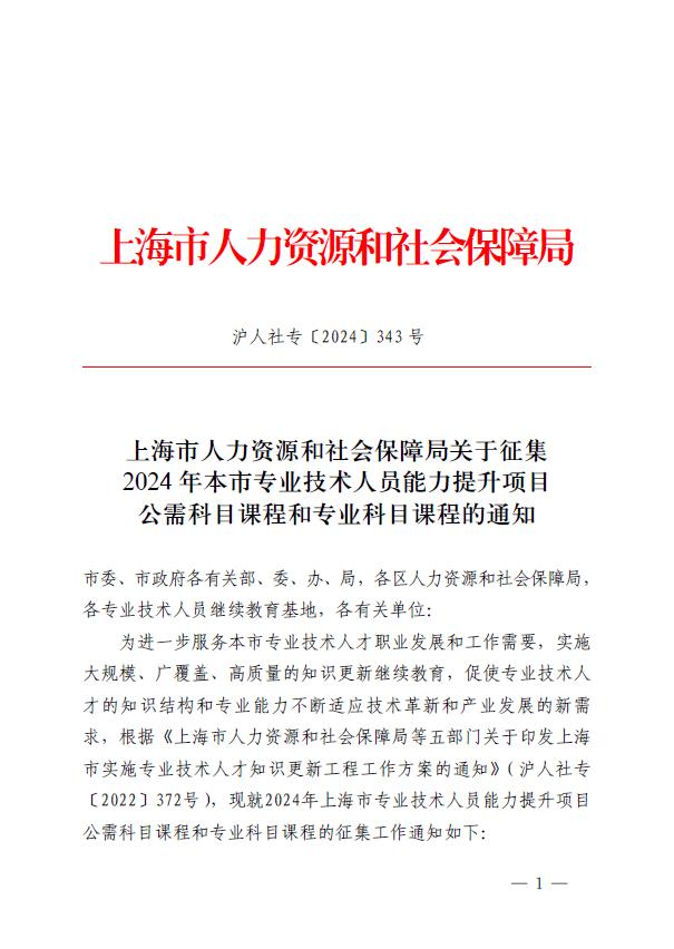 为进一步服务本市专业技术人才职业发展和工作需要,实施大规模、广覆盖、高质量的知识更新继续教育,促使专业技术人才的知识结构和专业能力不断适应技术革新和产业发展的新需求,根据《上海市人力资源和社会保障局等五部门关于印发上海市实施专业技术人才知识更新工程工作方案的通知》(沪人社专〔2022〕372号),现就2024年上海市专业技术人员能力提升项目公需科目课程和专业科目课程的征集工作通知如下: